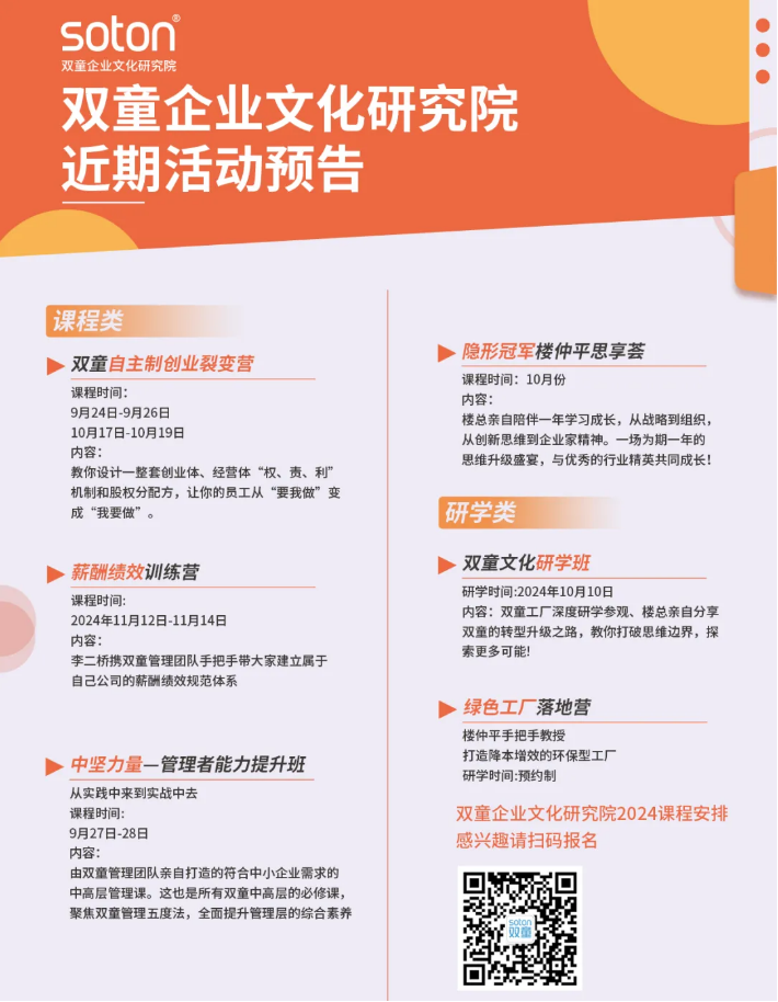 如果你也對“雙童”充滿好奇,也想賦能團隊共同成長,歡迎走進10月10日【雙童文化研學班】,與上百位優(yōu)秀的創(chuàng)業(yè)者一起學習!少量名額,歡迎咨詢鎖定!同時,熱忱歡迎各大商會、協(xié)會及企業(yè)提前單獨成團預約哦~