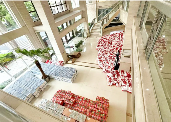 從二樓望下去一樓大廳都被禮品占滿啦