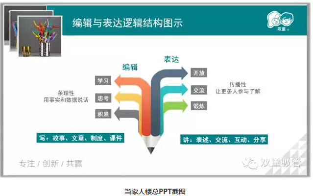 在講課過程中,當(dāng)家人樓總也重點闡述了他在偉雅老師和指間柔沙老師影響下,培育“雙童”文宣團隊的過程。從最開始的不斷失敗,到手把手把吸管妞帶在身邊培養(yǎng),再到慢慢形成五人編制的文宣團隊,中間可謂是一波三折。
