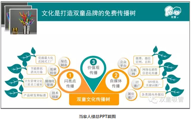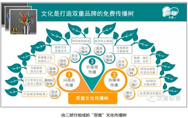 上邊則是政府、媒體關(guān)注的價值觀傳播。三大部分組成了“雙童”的文化傳播樹!而這棵樹也清晰系統(tǒng)地說明了“雙童”是如何傳播“故事”、塑造品牌的!