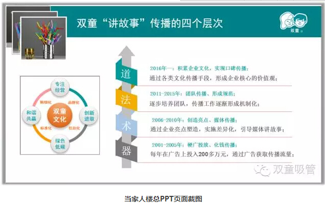 當(dāng)家人也向大家分享了老子的“器”、“術(shù)”、“法”、“道”四個層次來說明講故事由低到高的過程。“器”靠花費廣告費去引進流量,“術(shù)”靠亮點的塑造、媒體的傳播,而“法”靠培養(yǎng)團隊,形成規(guī)范傳播。“雙童”目前講故事的水平還處在“法”的階段,通過講故事把文化傳播出去,進一步追求“道”的層面,形成企業(yè)核心的價值觀,形成企業(yè)文化的口碑傳播。