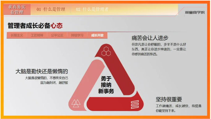 因為企業(yè)的管理者,不僅扮演著連接戰(zhàn)略和執(zhí)行的關(guān)鍵角色,還承擔(dān)著推動企業(yè)持續(xù)成長和創(chuàng)新的重要責(zé)任,所以企業(yè)期望的管理者是一個思維有高度、帶人有溫度、做事有力度、成長有速度的人。