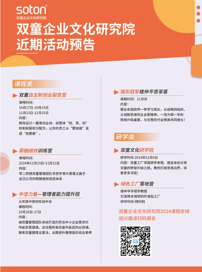 從樓總的分享中,我們能清晰地感知到,他一直在尋求破界、創(chuàng)新,每當(dāng)企業(yè)趨于穩(wěn)定時(shí),他就會(huì)扮演“攪局者”的角色,打破現(xiàn)有的平衡。也正是創(chuàng)始人這種“于無(wú)聲處聽驚雷”的未雨綢繆,才能讓雙童在每次危機(jī)來(lái)臨時(shí),都能成功“闖關(guān)”,穿越一個(gè)個(gè)成長(zhǎng)周期!