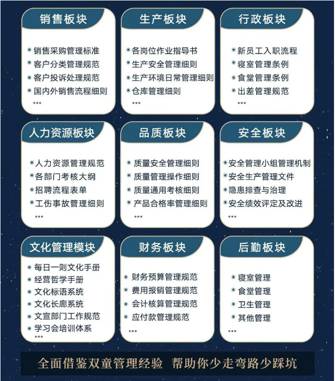 所以,入學(xué)“隱形冠軍樓仲平思享薈”之后,項(xiàng)目組會(huì)將“雙童”積累了30年、包含了銷(xiāo)售、生產(chǎn)、行政、人類(lèi)資源、品質(zhì)、安全、文化管理、財(cái)務(wù)和后勤等9大板塊,近600份管理規(guī)范文件,全部打包給學(xué)員,幫助學(xué)員企業(yè)能夠全面借鑒雙童管理經(jīng)驗(yàn)、少走彎路、少踩坑!