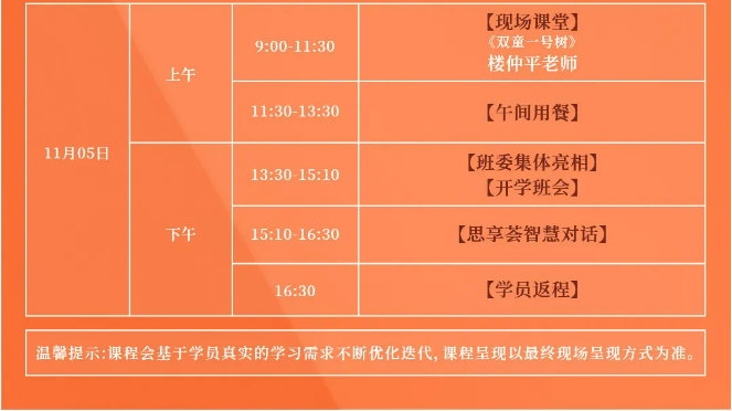 《創(chuàng)業(yè)者成長(zhǎng)》作為樓仲平弟子班的啟動(dòng)模塊,將用時(shí)4天3晚完成交付,旨在深度挖掘“雙童”近30年的成長(zhǎng)歷程背后創(chuàng)始人樓仲平的成長(zhǎng)方式,從而樓老師的思維與認(rèn)知遷移到學(xué)員自身的成長(zhǎng)和所在企業(yè)的成長(zhǎng)上。
