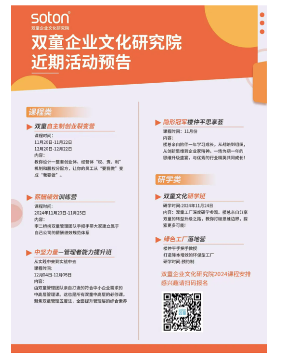 如果你也對“雙童”充滿好奇,也想賦能團隊共同成長,歡迎走進11月24日【雙童文化研學班】,與上百位優(yōu)秀的創(chuàng)業(yè)者一起學習!少量名額,歡迎咨詢鎖定!