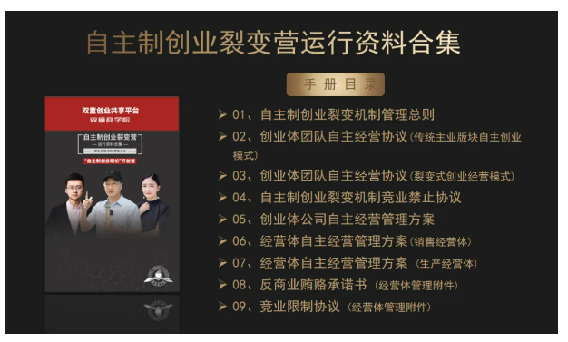 3)組織治理模塊:《自主制創(chuàng)業(yè)裂變營》專注于組織機(jī)制創(chuàng)新,幫助學(xué)員輸出一套企業(yè)組織創(chuàng)新方案,激發(fā)個(gè)體活力,推動企業(yè)裂變式增長。