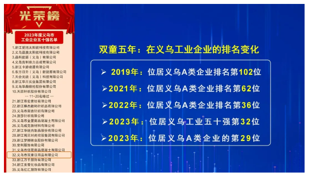 在自主制創(chuàng)業(yè)裂變的加持下,“雙童”在三年疫情期間,也實現(xiàn)了2.6倍的增長,從2018年到2023年,5年時間,更是再造了3.5個“雙童”,成功入圍“義烏工業(yè)企業(yè)五十強”!