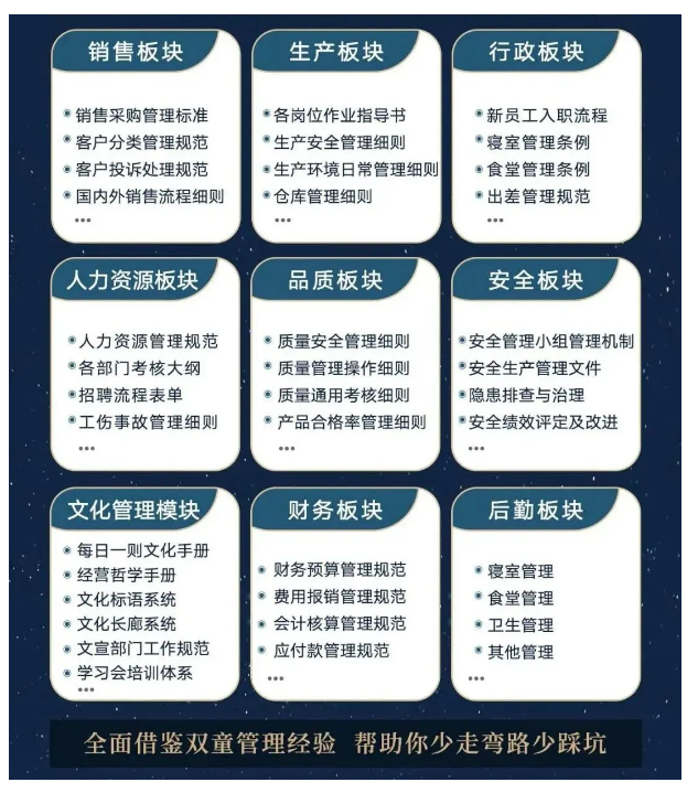 所以,入學“隱形冠軍樓仲平思享薈”之后,項目組會將“雙童”積累了30年、包含了銷售、生產、行政、人力資源、品質、安全、文化管理、財務和后勤等9大板塊,近600份管理規(guī)范文件,全部打包給學員,幫助學員企業(yè)能夠全面借鑒雙童管理經驗、少走彎路、少踩坑!