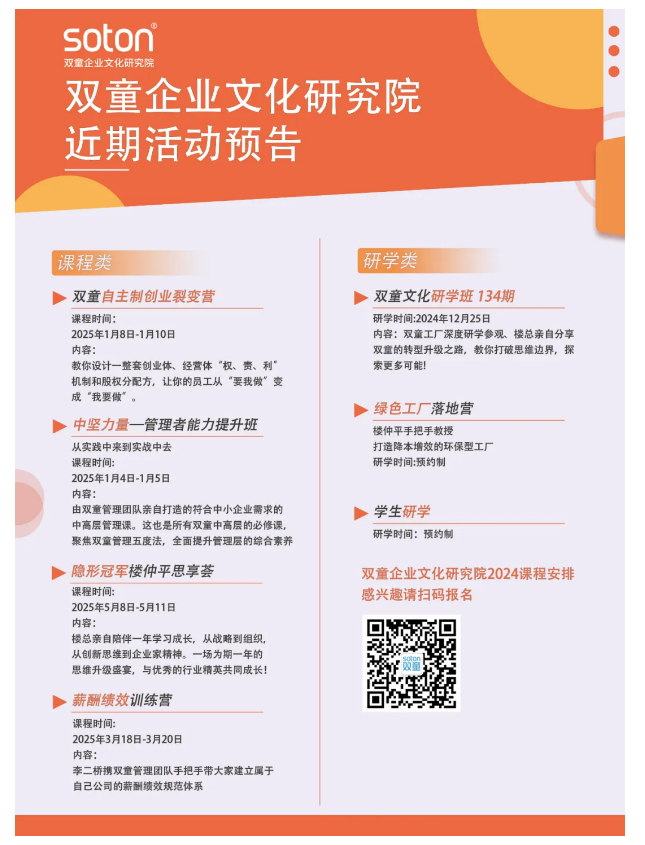 如果你也對“雙童”充滿好奇,也想賦能團隊共同成長,歡迎走進12月25日走進第134期【雙童文化研學班】,與上百位優(yōu)秀的創(chuàng)業(yè)者一起學習!