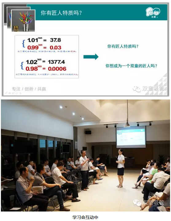 “你有匠人特質(zhì)嗎?”接下來吸管妹妹和大家做了個很有意思的互動,1.01的365倍是37.8,1.02的365倍是1377.4,反之,少了0.01,365天之后,你就比別人少了很多。可見,一天兩天的改變或許看不出什么,但是每天都努力一點點,每天都進(jìn)步一點點,發(fā)生的變化將是巨大的!
