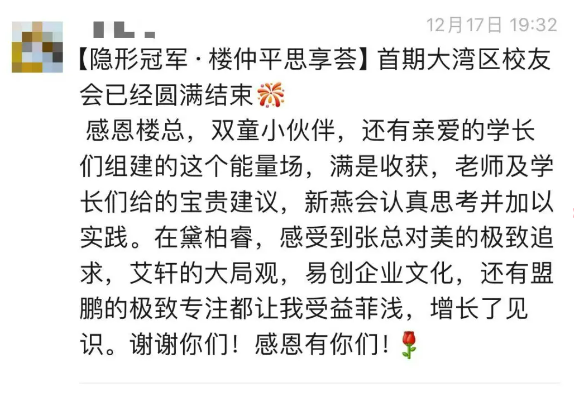 一直以來,樓仲平【思享薈】最珍貴的東西除了知識,還有一個最讓人動容的東西就是校友們的真情!每一次相聚,都像是闊別重逢的老友,無論是在雙童,還是在大灣區(qū)校友會晚宴上,大家都能把酒言歡,都有說不盡的言語!
