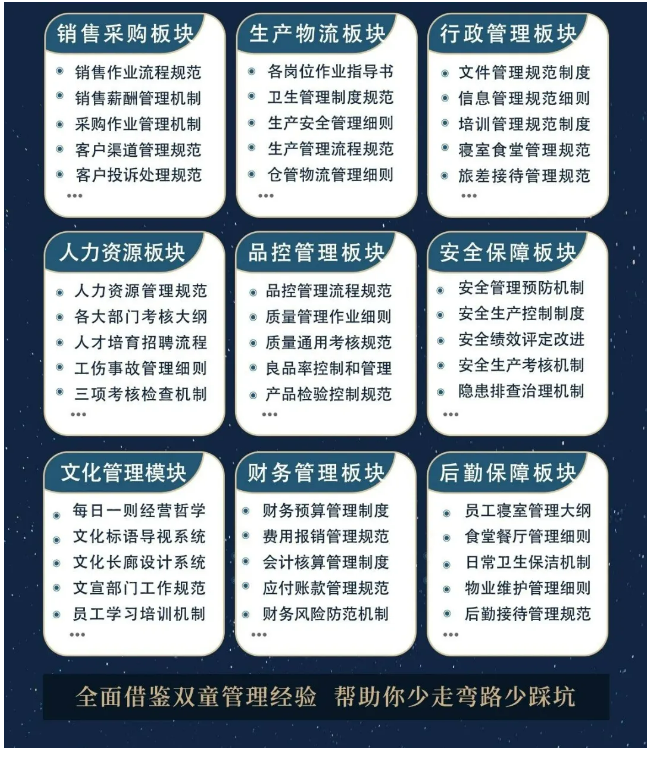 所以,入學(xué)“隱形冠軍樓仲平思享薈”之后,項目組會將“雙童”積累了30年、包含了銷售、生產(chǎn)、行政、人力資源、品控、安全、文化管理、財務(wù)和后勤等9大板塊,近600份管理規(guī)范文件,全部打包給學(xué)員,幫助學(xué)員企業(yè)能夠全面借鑒雙童管理經(jīng)驗、少走彎路、少踩坑!