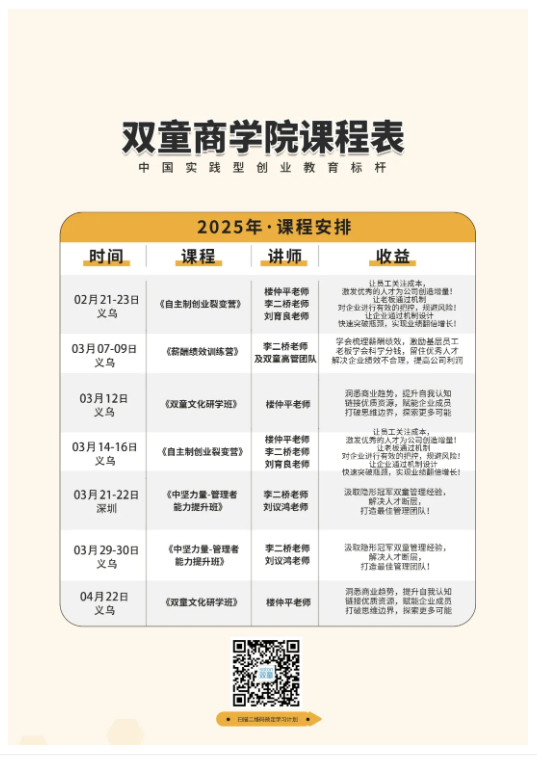 早在2022年,雙童商學院就針對該機制打磨成《自主制創(chuàng)業(yè)裂變營》課程,并不斷地升級迭代,以助力更多中小企業(yè)也能運用這套機制實現快速增長!