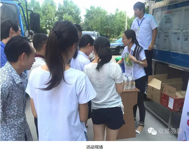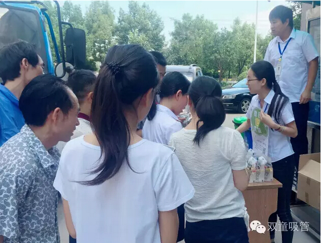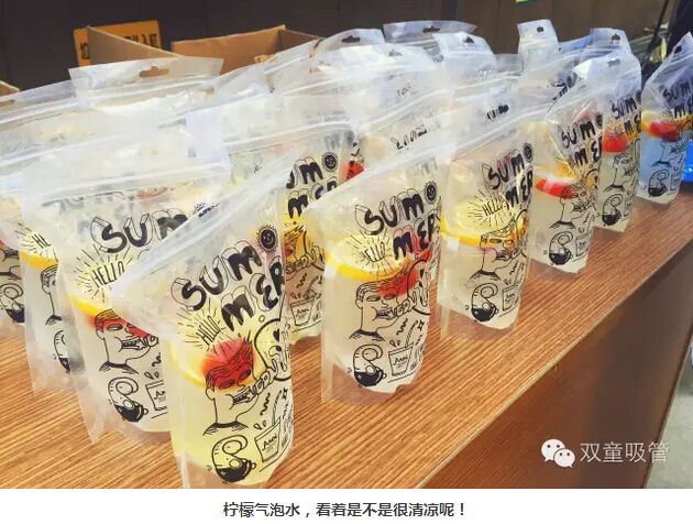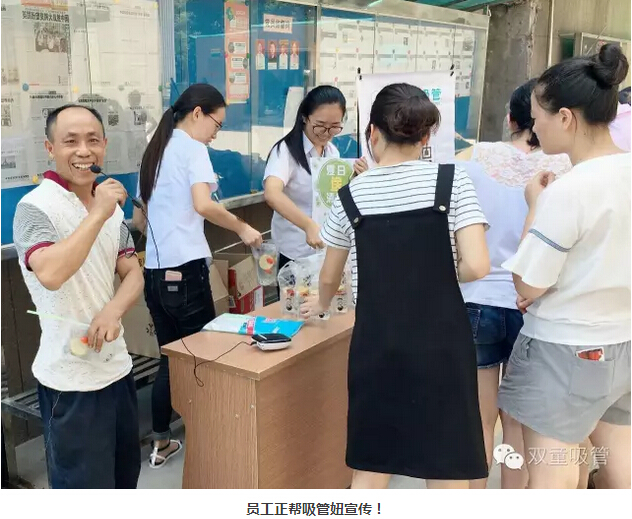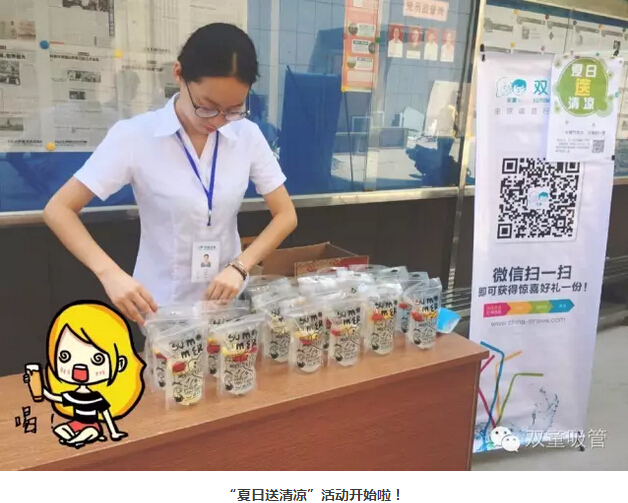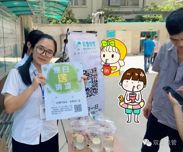 瞧!我們剛開張,就吸引了不少正要去吃飯的員工們。原來,拿到飲料的方法特別簡(jiǎn)單,只需要關(guān)注“雙童吸管”的微信公眾平臺(tái)并轉(zhuǎn)發(fā)微信,即可獲得檸檬氣泡水一袋呢!看來吸管妞為了微信的推廣也是絞盡腦汁啦!