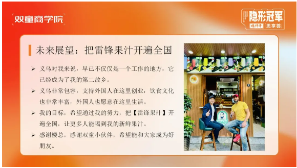雷鋒老師告訴同學們,截至目前,“雷鋒果汁”已成功開設了七家分店,且其業(yè)務持續(xù)繁榮的背后,主要得益于四大核心推動因素: