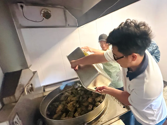 一千多個(gè)粽子被裝進(jìn)了十幾個(gè)框子里,這分量可不小,不管男同胞女同胞,一齊上陣將它們抬到廚房里。