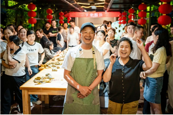 由于各個(gè)崗位的年輕人都沒(méi)有親自做過(guò)粽子,手忙腳亂地做出來(lái)的粽子始終不成型。樓總便趕忙邀請(qǐng)了他的幾位親戚過(guò)來(lái)做“指導(dǎo)老師”,現(xiàn)場(chǎng)手把手傳承包粽子手藝。