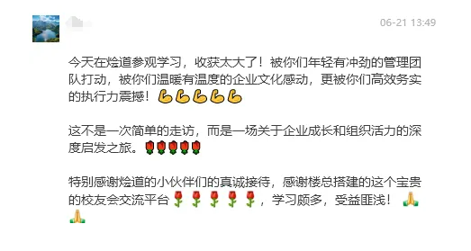 研學(xué)當(dāng)天,山東校友會抵達燴道,便受到創(chuàng)始人朱濤總攜核心管理團隊及相關(guān)部門負責(zé)人的熱情迎接,還收到了精美的鮮花,在芳香中開啟了研學(xué)之旅。
