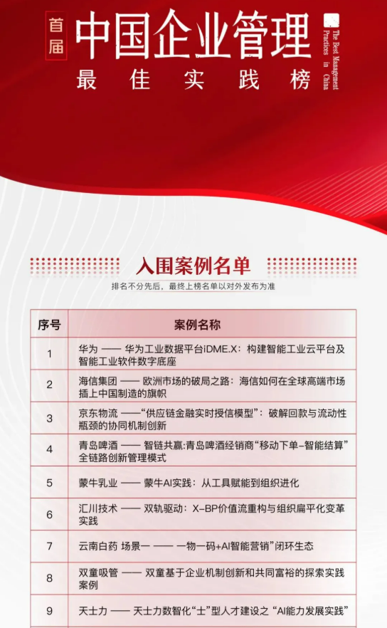首屆「中國(guó)企業(yè)管理最佳實(shí)踐榜」由“中國(guó)管理模式50人+論壇”與《財(cái)經(jīng)》雜志聯(lián)合發(fā)起,旨在結(jié)合當(dāng)前時(shí)代下最受關(guān)注的管理命題,尤其將側(cè)重關(guān)注在“AI+管理”方面的具有引領(lǐng)性和開(kāi)拓性的實(shí)踐,通過(guò)對(duì)基于場(chǎng)景的中國(guó)企業(yè)管理最佳實(shí)踐的挖掘和推廣,為企業(yè)推薦可借鑒、復(fù)制的解決方案,幫助企業(yè)少走彎路,實(shí)現(xiàn)價(jià)值增長(zhǎng),推動(dòng)具有“技術(shù)理性與人文內(nèi)核”的中國(guó)方案走向世界。