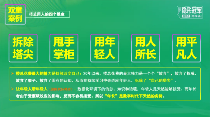 雙童提倡“用人所長,容人所短”。真正的“用人所長”是上下同欲的協(xié)同,需結(jié)合上司、自身和下屬三方所長,形成合力。對于優(yōu)秀人才,應(yīng)充分發(fā)揮其長處,弱化無關(guān)緊要的缺點,但堅守底線不容突破。