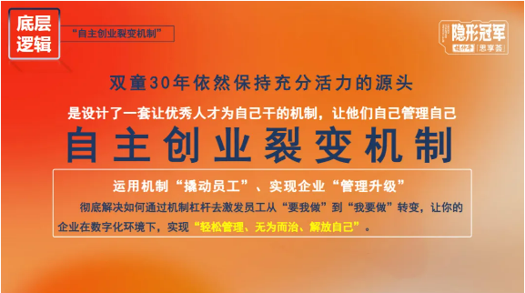 然而,傳統(tǒng)管控模式難以適應(yīng)新階段需求,而市面上成熟機(jī)制多基于大企業(yè)邏輯,無(wú)法直接適用于雙童。面對(duì)核心員工流失與資源閑置的雙重困境,他基于“以機(jī)制撬動(dòng)人效”的思路,在數(shù)字化環(huán)境下創(chuàng)新組織架構(gòu),探索出《自主創(chuàng)業(yè)裂變機(jī)制》,開(kāi)展了一場(chǎng)立足中國(guó)中小企業(yè)現(xiàn)實(shí)的組織創(chuàng)新實(shí)踐。