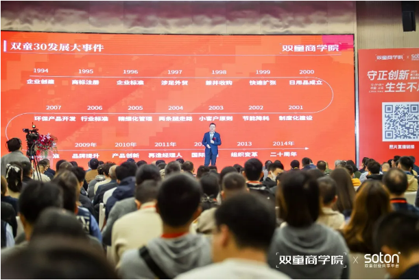作為企業(yè)24年發(fā)展的親歷者,李二橋回顧了雙童發(fā)展的大事件,講述了雙童是如何守品質(zhì)之正、持續(xù)創(chuàng)新突破。他的分享既有沉甸甸的實踐經(jīng)驗,又有鮮活的場景故事,引發(fā)了在場人員的陣陣掌聲與深度共鳴。