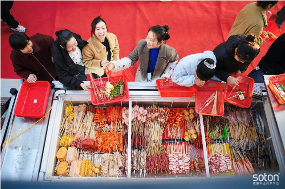 現(xiàn)場處處洋溢著溫馨與歡樂:烤串在爐火上滋滋作響,孜然香氣隨風飄散;鹵味攤前始終人氣不減,鴨頭酥香、炒粉鍋氣十足,讓人吃得暢快淋漓。甜品區(qū)則是孩子們的樂園,切糕扎實、蛋糕綿密,一張張小臉上寫滿了滿足。長桌上,從梅干菜餅到牛肉飯,天南地北的美食在此匯聚,笑語與食物的熱氣一同在林間縈繞,繪成一幅溫暖生動的歲末歡聚圖景。