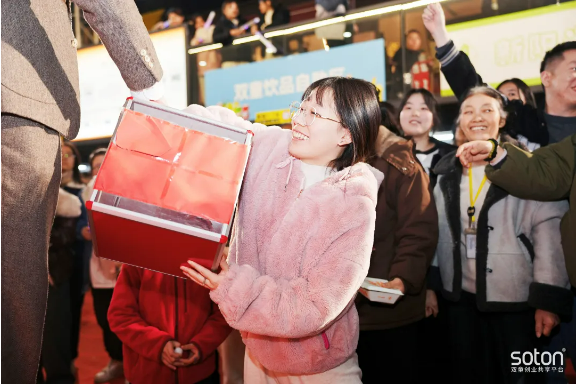 雙童創(chuàng)始人樓仲平也化身“圣誕老人”,親手為大家送上熱騰騰的烤串與代金券,將暖意傳遞至每個人手心?,F(xiàn)場還精心準備了三十張刮刮樂彩蛋,大家興致勃勃地刮開涂層,歡笑聲此起彼伏,更有人幸運中得驚喜大獎,點燃了全場!