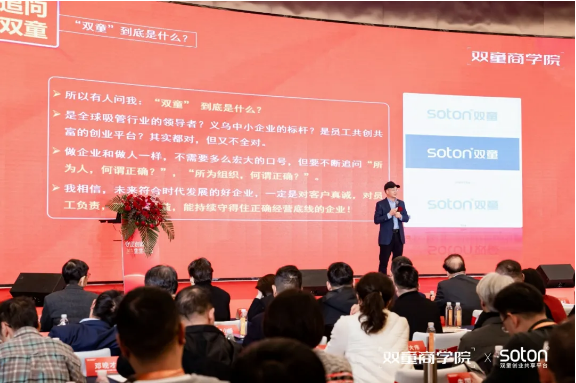 愿景,“打造共同富裕的共創(chuàng)平臺(tái),做有利于社會(huì)的好企業(yè)”,以創(chuàng)造廣泛的社會(huì)價(jià)值為根本宗旨,通過構(gòu)建開放包容的賦能平臺(tái),致力于促進(jìn)包括物質(zhì)、能力、機(jī)會(huì)在內(nèi)的全方位“共同富裕”。 核心價(jià)值觀,“致力成長(zhǎng),協(xié)同共生”,這八個(gè)字凝聚了雙童的發(fā)展智慧。致力成長(zhǎng)要求組織與個(gè)人保持持續(xù)進(jìn)化;協(xié)同共生則主張?jiān)谂c各方關(guān)系中尋求共贏,在利他中實(shí)現(xiàn)可持續(xù)發(fā)展。 這三個(gè)維度的相互支撐構(gòu)成了雙童三十余年實(shí)踐中沉淀出的經(jīng)營(yíng)哲學(xué),為企業(yè)從傳統(tǒng)制造向共享平臺(tái)轉(zhuǎn)型提供了根本指引,也為中小企業(yè)的可持續(xù)發(fā)展提供了可借鑒的實(shí)踐路徑。 樓仲平老師闡述《雙童經(jīng)營(yíng)哲學(xué)》的核心綱要 樓仲平老師總結(jié)道,經(jīng)營(yíng)的終極修行存在于具體的事與問題之中,其底層邏輯正是對(duì)“何為正確”的不斷探尋與實(shí)踐。而“何為正確”沒有終極答案,它存在于持續(xù)為社會(huì)創(chuàng)造價(jià)值、追求更多人幸福的每一個(gè)行動(dòng)之中。 樓仲平老師對(duì)雙童作出解讀