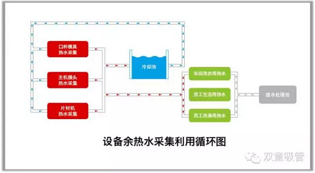 “雙童”采用引用的日本技術(shù)對(duì)所有生產(chǎn)設(shè)備的余熱和廢氣進(jìn)行采集并回收,再通過空調(diào)管道輸送到需要加溫的各個(gè)車間和工段,在減少大量工業(yè)排放同時(shí)也為企業(yè)節(jié)省了大量的空調(diào)電耗支出,對(duì)所有經(jīng)過模具的50度溫水進(jìn)行收集并供應(yīng)到所有寢室的衛(wèi)生間給員工洗澡洗衣用,從而徹底消除鍋爐,節(jié)省了大量煤電資源和人工管理,降低了工業(yè)排放和煤炭污染。