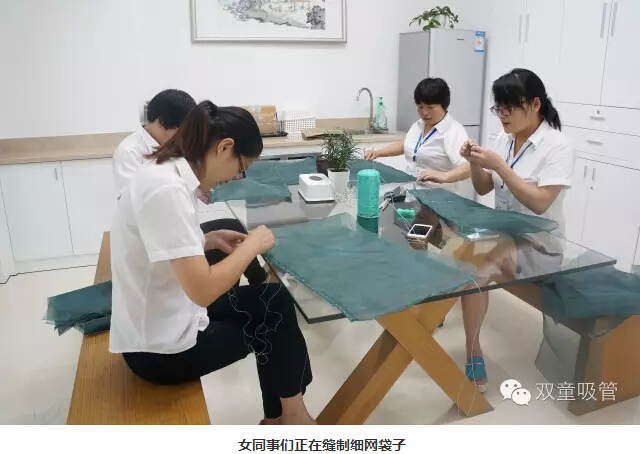 為此,我們的辦公室還發(fā)掘出了一批“繡娘”呢!辦公室的女同胞們在吸管妞的組織下,全都手工縫制起了用于裝置活性炭的細網袋子!2016年最新款“雙童”手工袋,全球限量發(fā)行,你值得擁有!