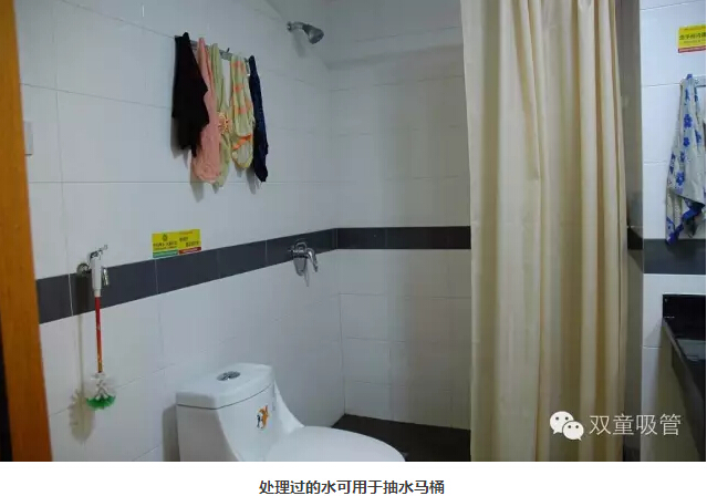 最后經過處理的水就已經達到了三類水的標準,中水通過設在池中的抽水泵打到屋頂,專門用于宿舍衛(wèi)生間的馬桶沖水、綠化澆灌和道路清洗。