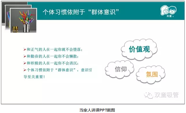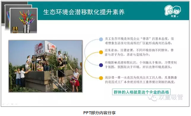 就好比剛來“雙童”的新員工,剛進(jìn)廠門的時(shí)候會(huì)隨地吐痰??墒沁^了一段時(shí)間,看到大家都不會(huì)這么做,再加上在干凈整潔的環(huán)境下也不好意思再隨地吐痰。久而久之,自身的壞習(xí)慣也慢慢地消失,養(yǎng)成了好的行為習(xí)慣!
