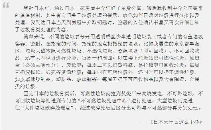 《日本為什么這么干凈》,這是一位普通中國(guó)人在日本度過三個(gè)月所記錄下的文章。無論中國(guó)人對(duì)于日本有多么不同的看法,但有一點(diǎn)肯定能達(dá)成共識(shí):日本非常干凈。日本的干凈很大程度上得益于嚴(yán)格的垃圾分類與處理。但如果沒到日本生活過,很難體會(huì)日本人對(duì)于垃圾分類以及處理的嚴(yán)苛,幾乎到了令人發(fā)指的程度!