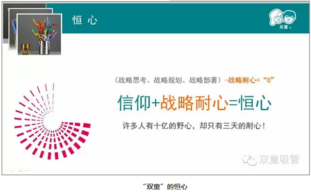 “恒心”是用長遠(yuǎn)的眼光去看問題,我們強(qiáng)調(diào)戰(zhàn)略思考、戰(zhàn)略規(guī)劃、戰(zhàn)略部署,唯獨(dú)缺少戰(zhàn)略耐心。“雙童”堅持小客戶原則,堅持對員工投入,堅持走差異化的道路,“雙童”的發(fā)展也越來越好。創(chuàng)新就是改變,就是持續(xù)積累。創(chuàng)新需要戰(zhàn)略耐心,需要十年為一個單位的恒心。