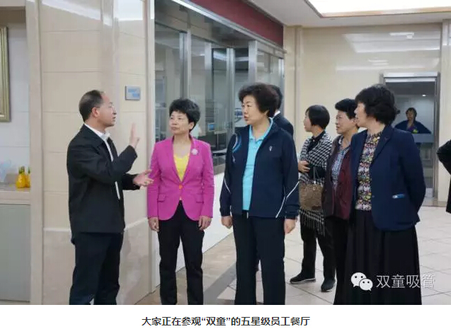 參觀結(jié)束之后,領(lǐng)導(dǎo)們也說了一定要去看看“雙童”著名的五星級(jí)員工餐廳!當(dāng)家人樓總介紹到:“餐廳內(nèi)的設(shè)施都配備了最好的硬件,就拿桌子來說,員工餐廳的每一張桌子重達(dá)四五百斤,是木中之王的柚木定制而成,每一張就要15000元。另外員工的餐飲都是三菜一湯的標(biāo)配,員工們使用后的所有碗筷都由食堂阿姨進(jìn)行清洗和消毒,同時(shí)鼓勵(lì)員工的家人也一起在餐廳就餐。”