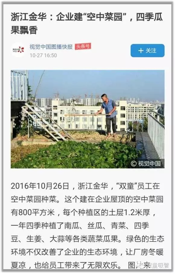 “雙童”的屋頂菜園、節(jié)能降耗措施等生態(tài)建設(shè)引起了不少政府和媒體的關(guān)注!這不,10月底,義烏宣傳部的攝影記者也來到“雙童”,實(shí)地參觀“雙童”的屋頂菜園,回去后寫了一篇圖文報(bào)道,此篇報(bào)道被發(fā)布在《今日頭條》、《視覺中國》等多家媒體上,引發(fā)了大量轉(zhuǎn)發(fā)和關(guān)注!少說話,多放圖,讓大家一飽眼福?。?!