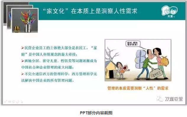 從管理的本質上來說,管理理念也應該與當?shù)氐膫鹘y(tǒng)文化相結合,由于“家庭”是中國人傳統(tǒng)觀念的最大牽掛,所以在管理上不能一味學習西方管理科學。這幾年由于外出務工的農民工越來越多,兩地分居、留守兒童、性饑荒等問題逐漸成為中國社會和企業(yè)管理的重大問題。但因為形成了“家文化”氛圍,這些問題在“雙童”都得到了根本性解決,也讓企業(yè)避免了許多復雜性問題,更加和諧!