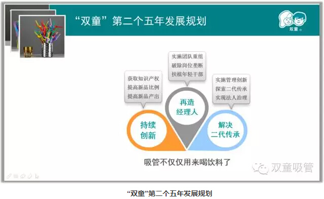 在同質(zhì)化競(jìng)爭(zhēng)日益激烈的大背景下,促使著“雙童”放棄做低端的吸管,做中高端產(chǎn)品。早在2005年,“雙童”頒布的第一個(gè)五年發(fā)展規(guī)劃中就提出了“創(chuàng)新提升”的關(guān)鍵詞。接下來兩個(gè)五年發(fā)展規(guī)劃中也提出了“持續(xù)創(chuàng)新”、“開展有效創(chuàng)新”的關(guān)鍵詞,以此作為今后的方向目標(biāo)和理念。