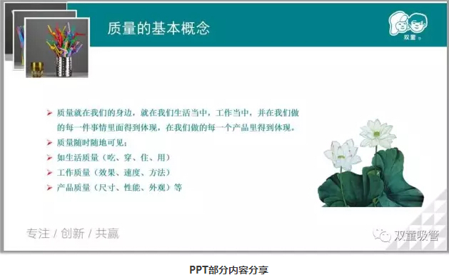 一開場(chǎng),陳講師先介紹了質(zhì)量的定義以及質(zhì)量管理的發(fā)展史,問及“雙童”的質(zhì)量方針時(shí),童鞋們都回答的異口同聲:“支支見品、杯杯見質(zhì);打造“雙童”品牌、提升顧客滿意。”