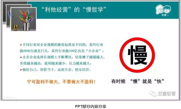 “利他經(jīng)營”的慢哲學(xué):太多企業(yè)選擇在規(guī)模上不斷攀比,結(jié)果攤子越鋪越大,負(fù)債越來越高,盈利越來越少,壓力越來越大。其實(shí)“慢”的本質(zhì)是不犯錯(cuò)誤少走彎路,不斷積累,有時(shí)候“慢”就是“快”!