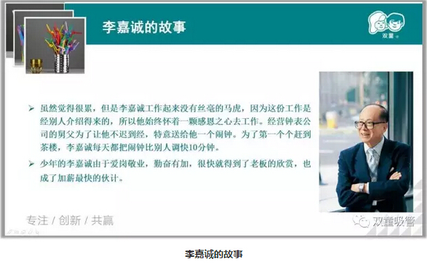 我們都應(yīng)該心懷感恩之心,用感恩的心去工作。妞也用李嘉誠的案例故事和童鞋們進行分享:“李嘉誠在茶樓當(dāng)伙計時,每天天未亮就出去工作,盡管每天工作時間長達(dá)15小時,也不會絲毫的懈怠馬虎,始終懷著一顆感恩之心去工作。在隨后的創(chuàng)業(yè)過程中,懷著感恩之心開創(chuàng)了屬于自己的事業(yè),成為華人首富。”李嘉誠的事例說明,感恩和敬業(yè)可以最大程度的激發(fā)一個人的潛能,使之迅速在職場中脫穎而出,無論你從事什么工作,都要牢記,用心者事競成!