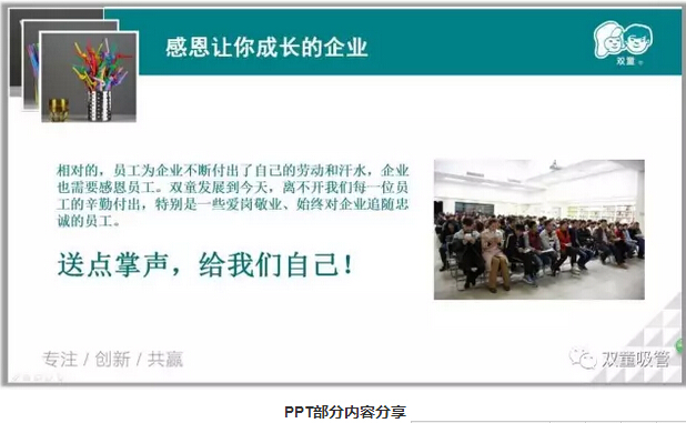 接下來,吸管妞進行了“實踐感恩之心”的主題分享,企業(yè)為我們提供了穩(wěn)定的薪水,解決了衣、食、住、行等生存所需,它使我們實現(xiàn)了經(jīng)濟上的安全,有了穩(wěn)定的工作,給我們提供了平臺和機會……說到這里,童鞋們的掌聲紛紛響起,感謝“雙童”,讓我們成長!