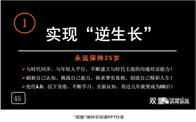 實現(xiàn)“逆生長”:“雙童”樓仲平通過不斷的到各地演講寫課件鍛煉自己,嘗試新的突破,喜歡挑戰(zhàn)新的東西,永遠將自己定位在25歲,不斷學(xué)習(xí)去認知新的世界,去擁抱這個高速變化的世界,從而影響團隊并保持“雙童”不被淘汰。最后,樓總也鼓勵所有在座的創(chuàng)業(yè)者不能老去,要與時代保持同步,接受不斷變化和挑戰(zhàn),迎合這個高度變化的世界!