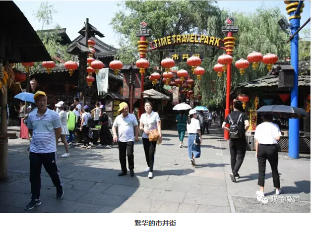 走進(jìn)景區(qū)內(nèi),一派市井熱鬧的景象!街衢縱橫,茶樓酒肆、藝場(chǎng)教坊林立,處處管弦笙歌。傳統(tǒng)賣藝耍大刀的當(dāng)街而舞、皮影戲、曲藝、 “繡球招親”、鬼屋,各類項(xiàng)目真是應(yīng)接不暇,“雙童”人都要high翻天啦!