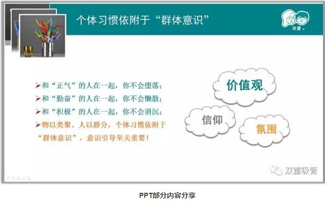 在企業(yè)中,管理的最高境界是自律,而自律就需要每個人改變自己,繼而形成高度統(tǒng)一的“群體意識”。因此,所有人的習(xí)慣都和企業(yè)有很大的關(guān)系,物以類聚、人以群分,個體習(xí)慣依附于“群體意識”,意識引導(dǎo)至關(guān)重要!