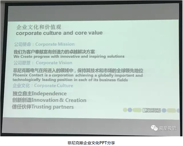 通過PPT介紹,我們了解到菲尼克斯獨(dú)特的企業(yè)文化價(jià)值觀,秉承“獨(dú)立自主、創(chuàng)新創(chuàng)造和信任伙伴”的企業(yè)文化,經(jīng)過中國公司二十三年的歲月沉淀,融入了中國優(yōu)秀的傳統(tǒng)文化和中國團(tuán)隊(duì)的智慧,中西合璧、兼收并蓄。我們發(fā)現(xiàn),菲尼克斯的企業(yè)文化價(jià)值觀與“雙童”高度趨同: