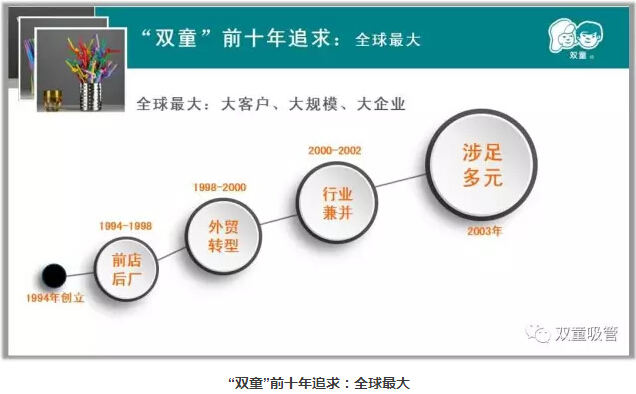 “‘雙童’在前十年也不斷追求‘大’,追求大客戶、大規(guī)模、大企業(yè)。在整個(gè)過(guò)程當(dāng)中,不僅產(chǎn)品的品質(zhì)越來(lái)越低,利潤(rùn)也越來(lái)越低。2005年,‘雙童’經(jīng)歷了痛苦的轉(zhuǎn)型,決定放棄繼續(xù)擴(kuò)張,在原有的規(guī)模下改變商業(yè)模式,寧可盈利不做大,不要做大不盈利,從‘全球最大’成長(zhǎng)為‘全球最強(qiáng)’。”