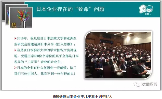 “工匠精神”其實(shí)是一把雙刃劍,樓仲平通過(guò)日本企業(yè)的案例闡述了這一觀點(diǎn):“去年開(kāi)始,我?guī)锥仁苋毡痉ㄕ髮W(xué)和亞洲企業(yè)研究會(huì)的邀請(qǐng)到日本分享《匠人思維》,在分享過(guò)程中,我發(fā)現(xiàn)一個(gè)很明顯的問(wèn)題,基本上來(lái)聽(tīng)課學(xué)習(xí)的幾乎是60歲以上的日本企業(yè)主,幾乎看不見(jiàn)年輕人。究其原因,是由于極致的工匠精神讓日本的年輕人不愿意接班。同時(shí),隨著日本企業(yè)主平均年齡越來(lái)越大,普遍缺乏時(shí)代變革下的創(chuàng)新思維,導(dǎo)致日本大量工匠企業(yè)被時(shí)代拋棄。所以,我們要慎防成也工匠精神,敗也工匠精神!”